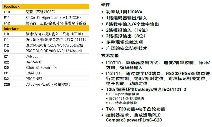 Compax3驅(qū)動(dòng)器為智能伺服驅(qū)動(dòng)器,適用于伺服電機(jī),異步電動(dòng)機(jī),直驅(qū)電機(jī),特點(diǎn)包括:絕對反饋,110/230 VAC,400/460 VAC,單軸技術(shù),多軸技術(shù),現(xiàn)場總線連接,Ethernet通訊,標(biāo)準(zhǔn)安全防護(hù)(STO),高級安全防護(hù),IEC 61131-3編程,應(yīng)用宏。