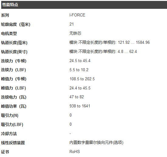 I-Force 110 無鐵芯直線電機峰值推力可達 200N, 卓越的加速度和緊湊的體積. 21mm 寬的無鐵芯設計具有零齒槽效應力,同時工字型骨架繞組提供很高的推力/體積密度比和優(yōu)越的散熱效果