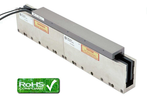 無鐵芯電機由一個動子(繞組),運行于雙磁軌之間。動子線圈中沒有任何矽鋼片 - 故名無鐵心。相反,銅繞組被環(huán)氧樹脂封裝,安裝于兩行磁體之間的空氣間隙中。因為繞組無鐵心,動子和磁軌之間沒有吸引力或齒槽力。無鐵芯動子因比有鐵芯動子更輕而可以產(chǎn)生極高的加速度和整體動態(tài)性能。無鐵芯設計因為沒有齒槽力和吸引力而延長了直線導軌壽命,并且在一些應用中,能夠選用較小的直線導軌。
