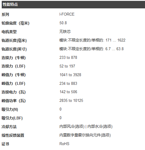 派克 I-Force 410 無鐵芯直線電機 相對于緊湊的體積提供高推力和急加速的能力. 持續(xù)推力范圍 233 N (52.4 lbf) to 878 N (197.5 lbf) ,峰值推力范圍 1041 N (234.1 lbf) up to 3928 N (883 lbf), 在I-Force系列提供極佳的性能和尺寸組合。專利的工字型骨架和重疊的繞組設計提高了電機的功率密度,改善了散熱,以及附加的結(jié)構(gòu)剛度。此外,無鐵心(或空氣芯)直線電機繞組與磁軌之間沒有吸引力。這樣便于安裝和運動過程中的零齒槽效應。I-Force系列配備了超高柔性電纜。此外,派克提供模塊化磁軌實現(xiàn)無長度限制的行程。令人難以置信的是平滑運行,高精度,高推力密度使I-Force系列直線電機成為要求苛刻的定位要求的理想解決方案。